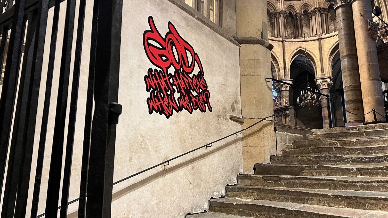 La instalación temporal de graffiti en la Catedral Anglicana de Canterbury, autorizada por el rector abiertamente homosexual, genera división de opiniones en la opinión pública.